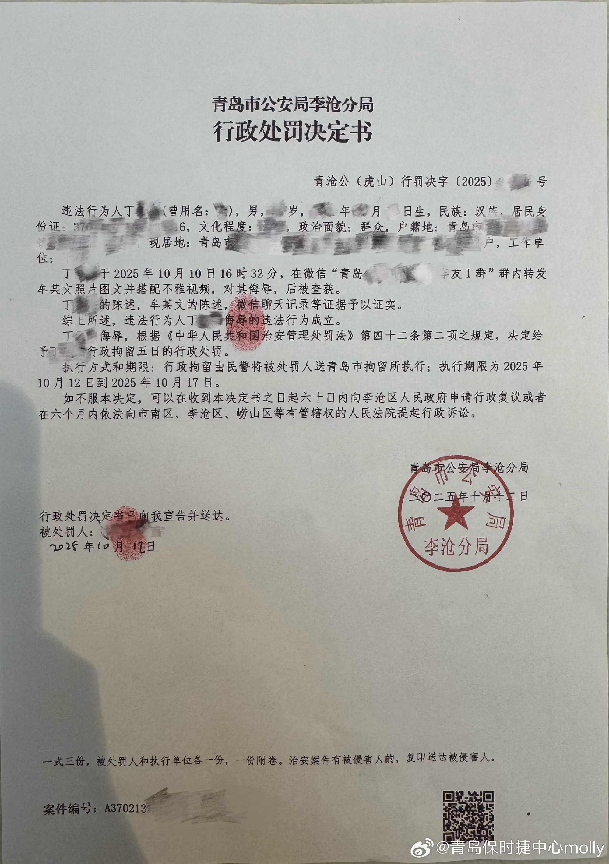12日牟女士发布的青岛市公安局李沧分局行政处罚决定书,主要是对违法行为链条中传播者丁某的处罚决定。决定书内容显示,2025年10月10日丁某在一微信车友群内转发牟女士照片图文并搭配不雅视频,对其侮辱,后被查获。根据《中华人民共和国治安管理处罚法》第四十二条第二项规定,给予丁某行政拘留五日的行政处罚。