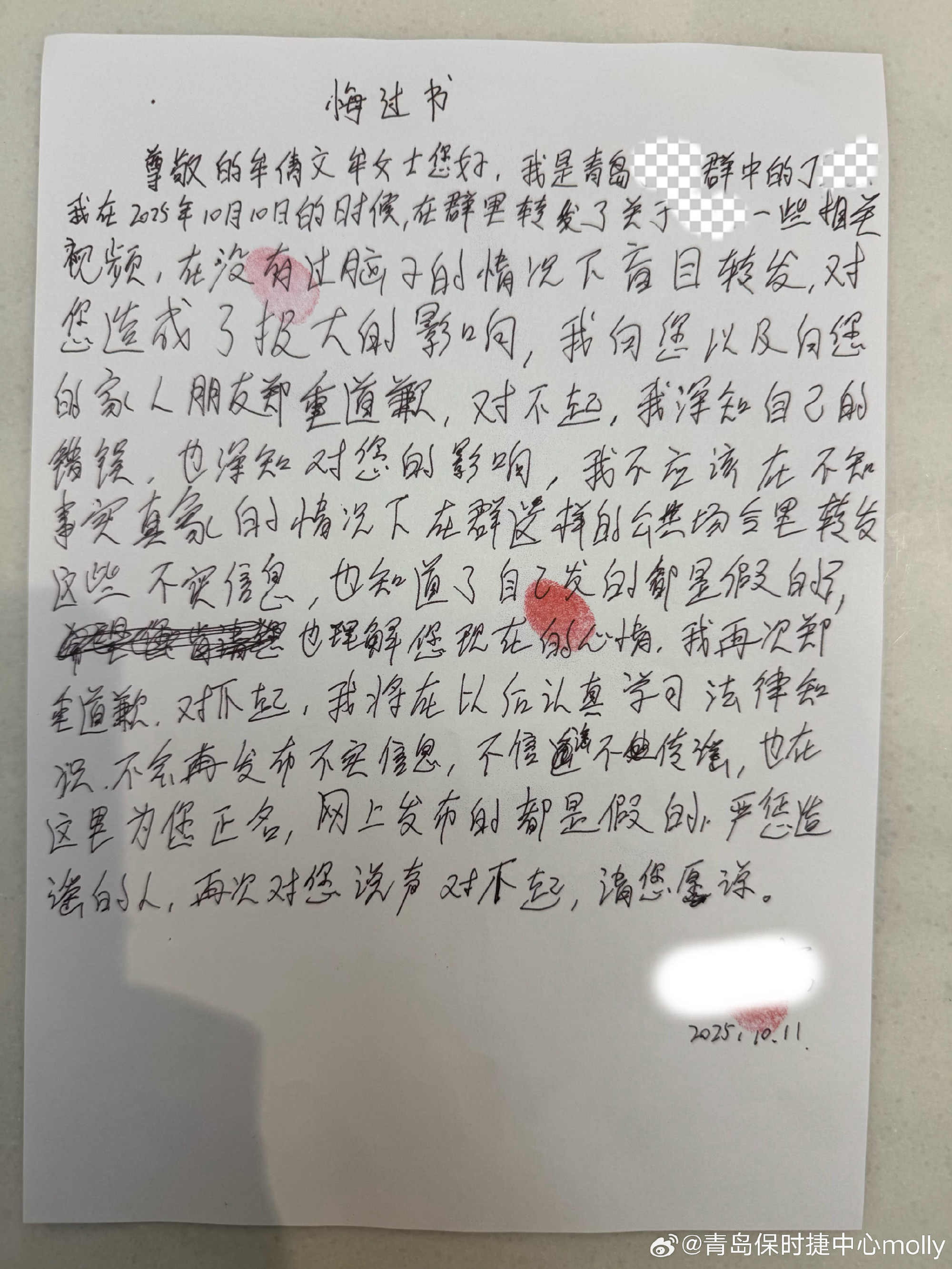违法行为人丁某在11日写下悔过书,承认自身错误并向牟女士道歉。但牟女士报案并启动法律程序追究所有涉案人员民事及刑事责任,直接进行AI合成图文与视频的违法者暂未抓获。牟女士表示,相关案件已正式进入司法程序,交由警方依法处理。